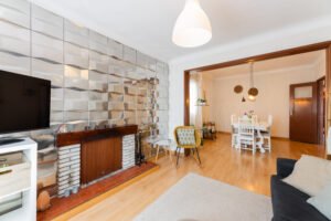 O imóvel dispõe de uma área útil de 105m², com divisões amplas, bem distribuídas e com excelente luminosidade natural. A sala destaca-se pelo seu ambiente acolhedor, equipada com lareira, perfeita para momentos de conforto em família.
