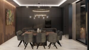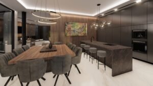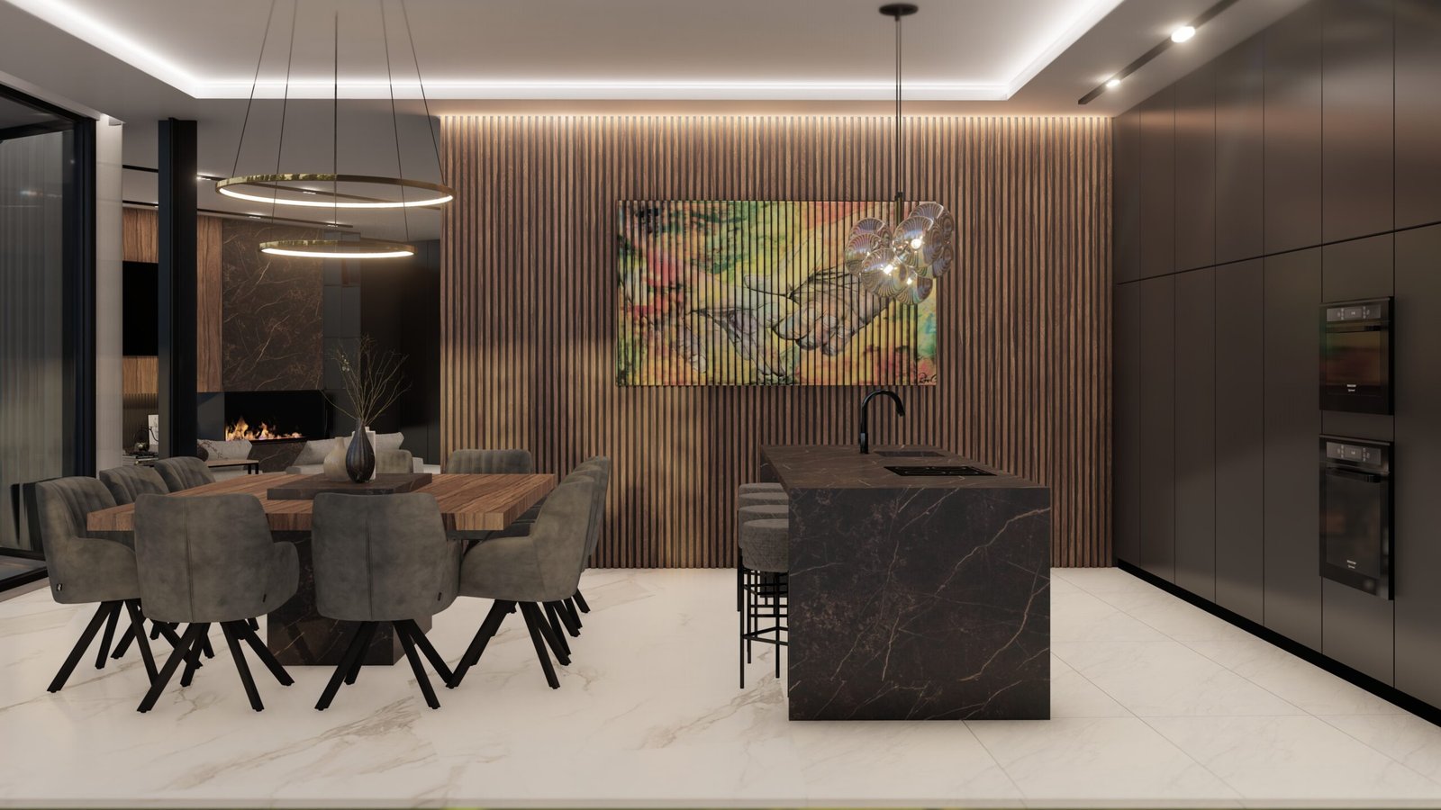 A zona social revela-se ampla e sofisticada, com uma cozinha e sala de jantar em conceito open space, complementadas por uma elegante sala de estar independente — ideal para criar diferentes ambientes, sempre com excelente luminosidade natural.